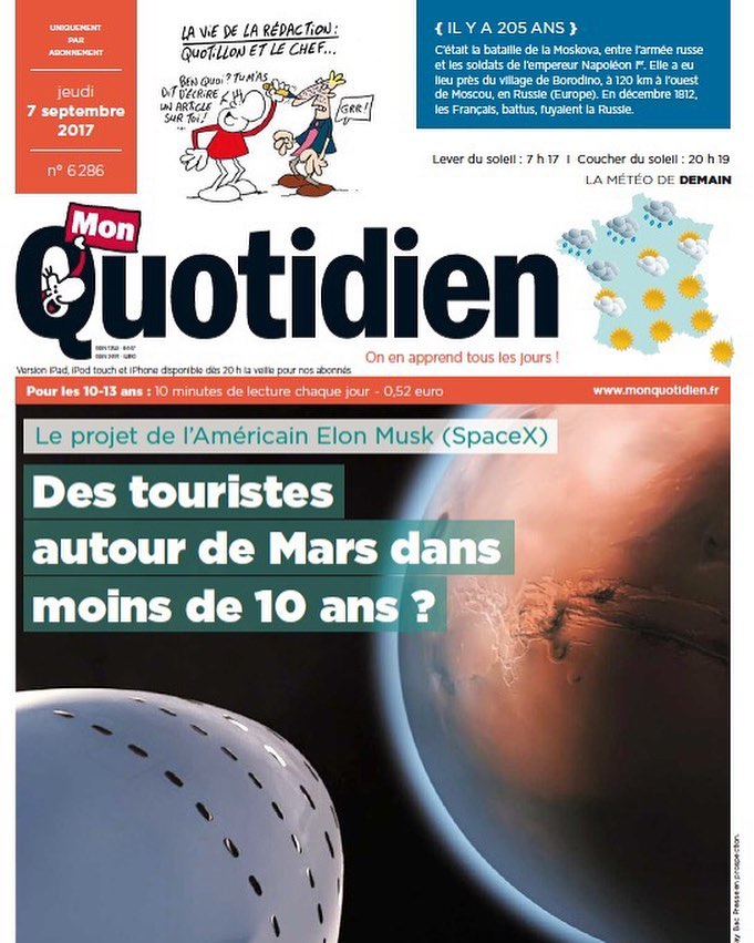 Alors que les élèves de la nouvelle génération de 6èmes viennent de se pencher sur le fil rouge de leur année, “installer une colonie Marsienne”(revoir le trailer )de formuler les problématiques de l’année, le sujet est plus que jamais au coeur de l’actualité scientifique comme le démontre cet article du 7/09 dans Mon Quotidien, célébre presse pour les 9-13 ans.